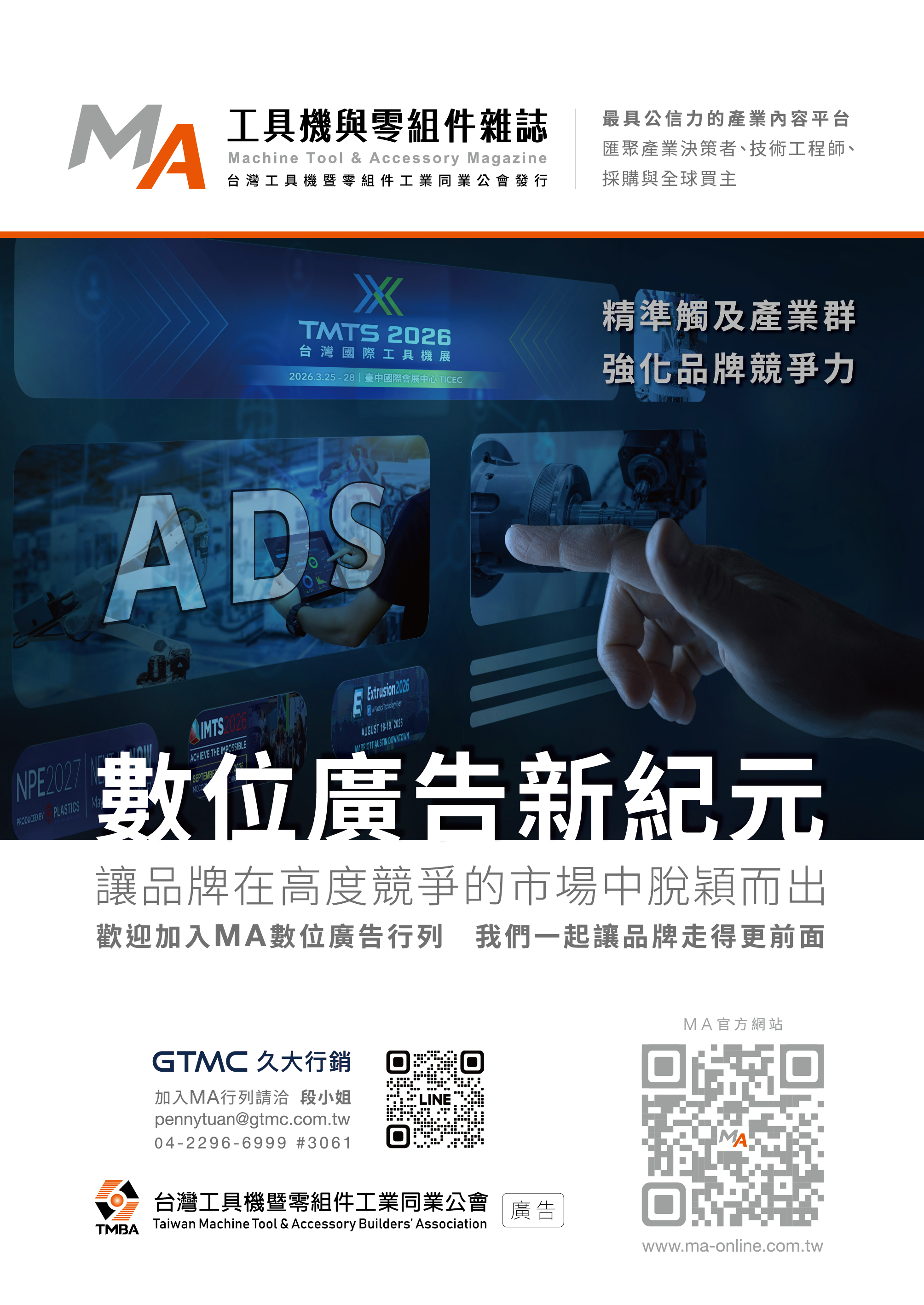 本會《MA工具機與零組件雜誌》於2026年1月1日起全面數位化,提供更即時、更精準的產業新訊。