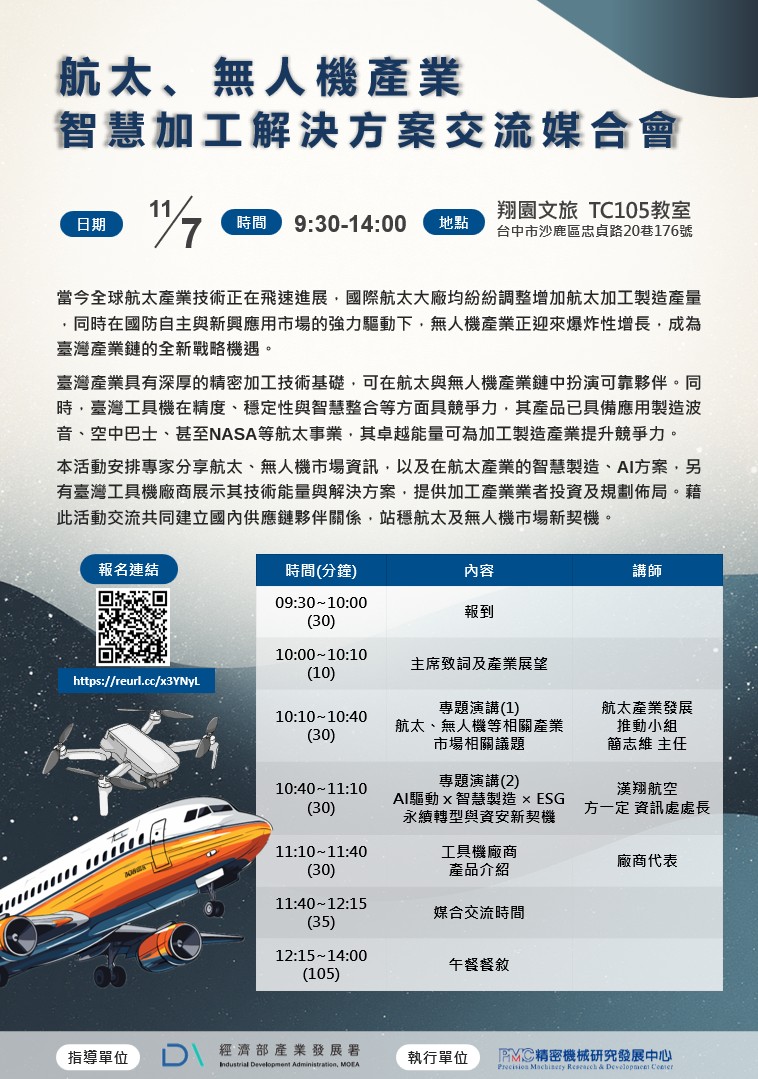 (轉發) 11/07_航太、無人機產業-智慧加工解決方案交流媒合會 (PMC主辦)