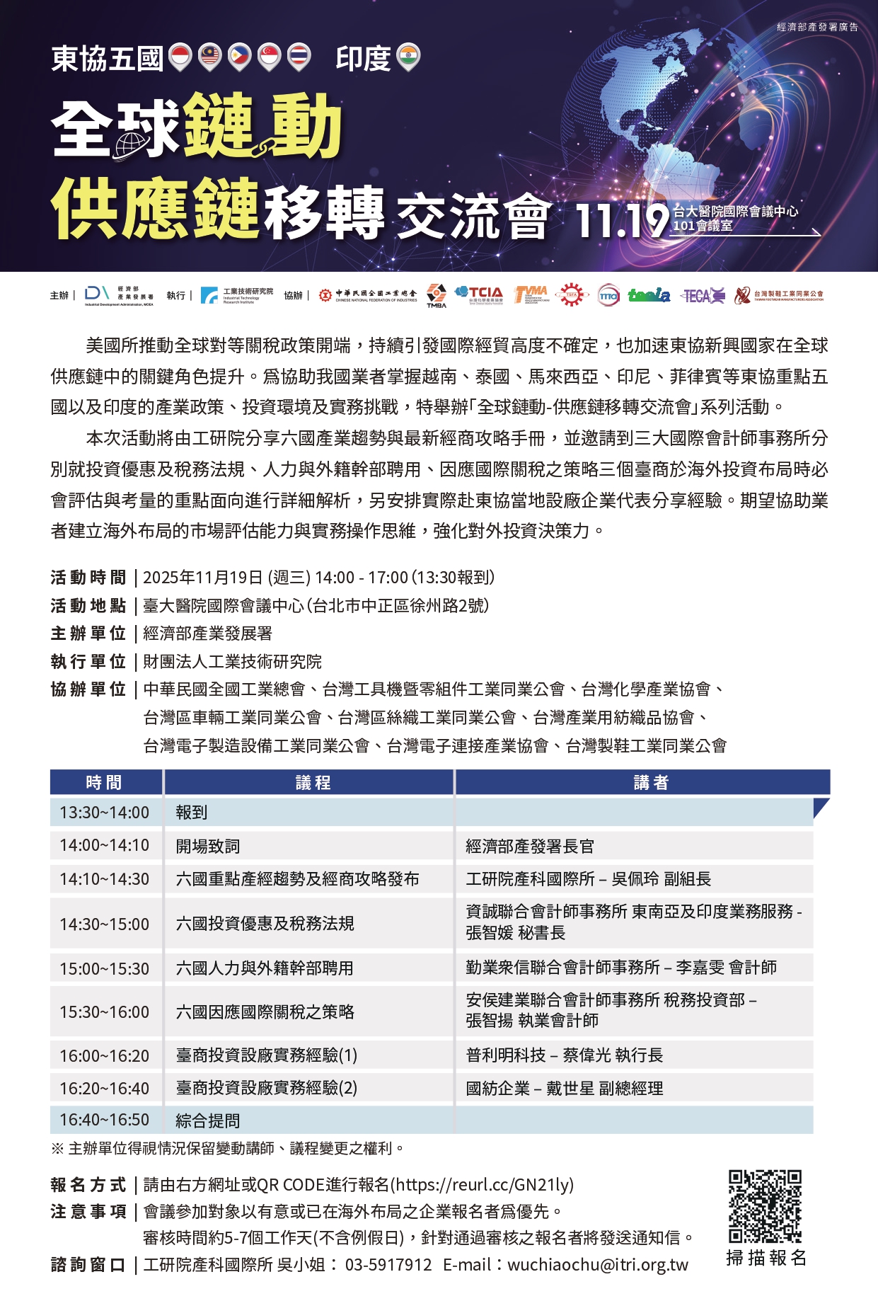 (轉發) 11/19_工研院-東協五國+印度 - 全球鏈動 供應鏈移轉交流會