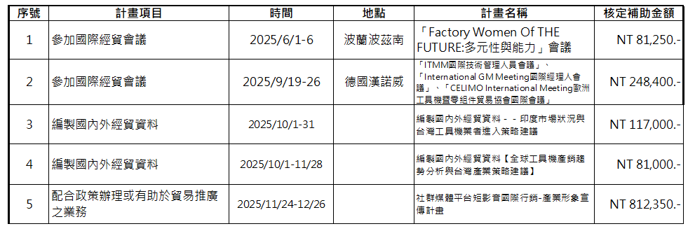 本會本(114)年度辦理國際貿易推廣計畫,國貿署核定補助之計畫內容如下表,補助金額共計新台幣1,034萬元。