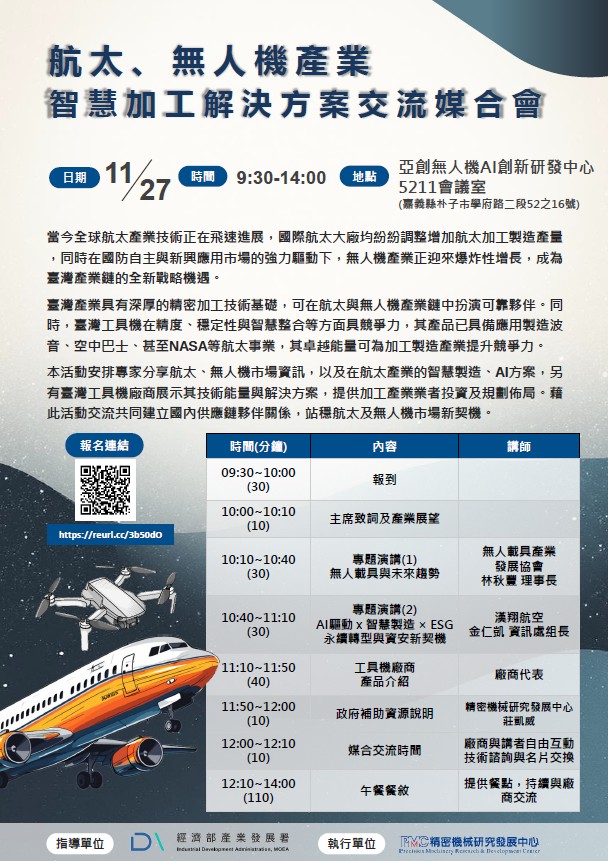 (轉發) 11/27 PMC-航太、無人機產業智慧加工解決方案交流媒合會(亞創場)