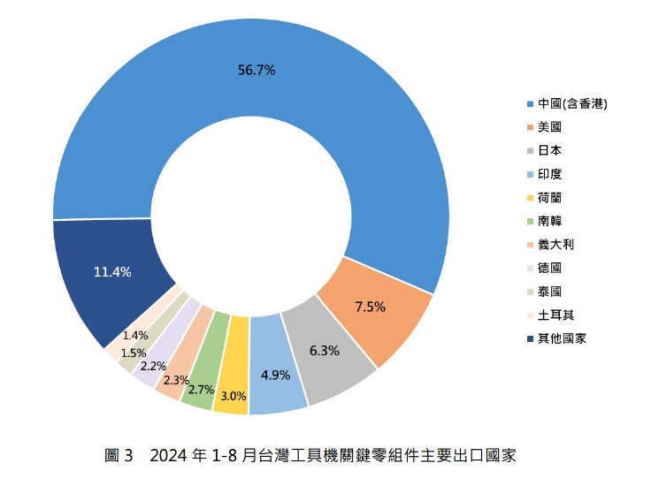 2024年1-8月工具機關鍵零組件主要出口國來看,中國(含香港)、美國、日本、印度、荷蘭、南韓、義大利、德國、泰國與土耳其。相關數據請參考表5、表6 及圖3。