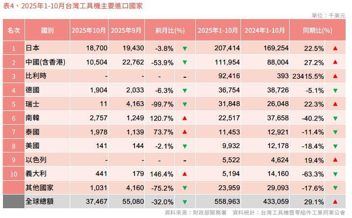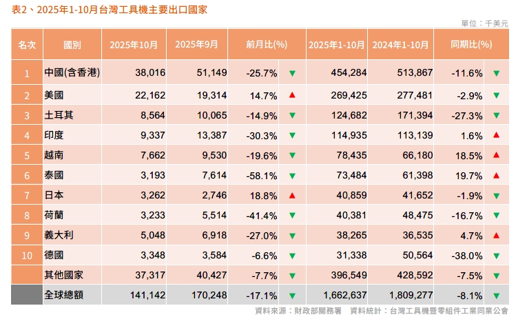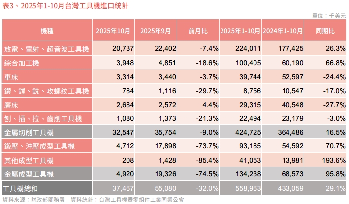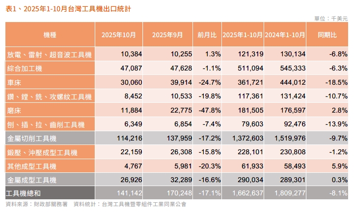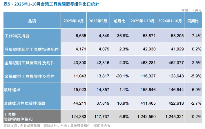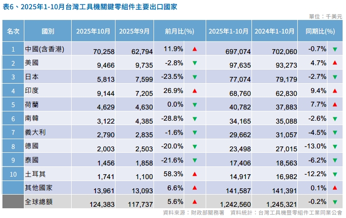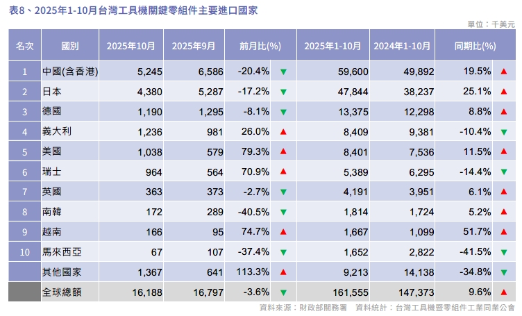 2025 年10月台灣工具機及關鍵零組件進出口速報