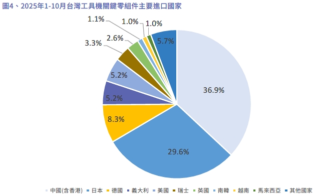 2025年1-10月工具機關鍵零組進口累計進口金額近1.62億美元,較2024年同期增加9.6%。2025年1-10月工具機關鍵零組件主要進口國來看,中國(含香港)、日本、德國、義大利、美國、瑞士、英國、南韓、越南及⾺來⻄亞。相關數據請參考表7、表8 及圖4。
