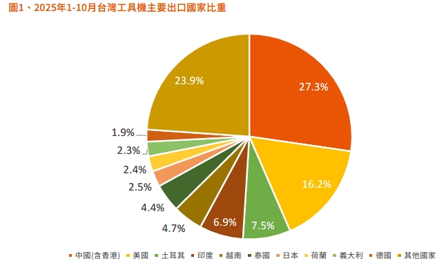 2025年1-10月工具機累計出口金額約為16.63億美元,較2024年同期減少8.1%。其中,金屬切削工具機出口累計金額約13.73億美元,較去年同期減少9.7%,金屬成型工具機出口累計金額為2.9億美元,較去年同期成長0.3%。2025年1-10月工具機出口前十大國家依出口金額排序為中國(含香港)、美國、土耳其、印度、越南、泰國、日本、荷蘭、義大利及德國。相關數據請參考表1、表 2 及圖 1。