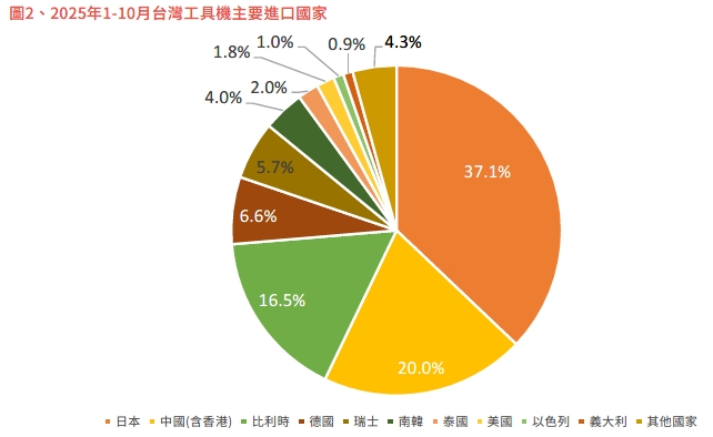 2025年1-10月工具機累計進口金額為5.59億美元,較2024年同期增加29.1%。其中,金屬切削工具機進口累計金額約為4.25億美元,較去年同期增加16.5%,金屬成型工具機進口累計金額為1.34億美元,較去年同期大幅增加95.8%。2025年1-10月工具機進口前十大國家依進口金額排序為日本、中國(含香港)、比利時、德國、瑞士、南韓、泰國、美國、以色列及義大利。相關數據請參考表3、表4及圖2。