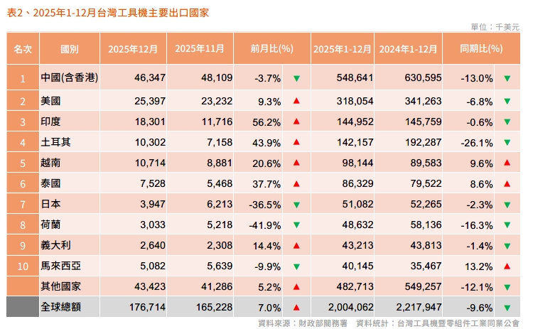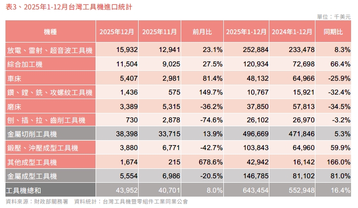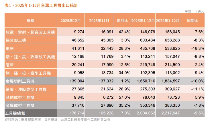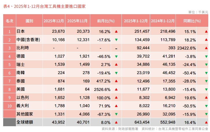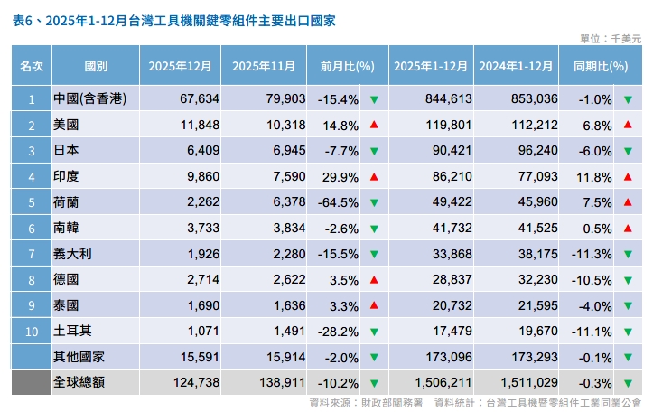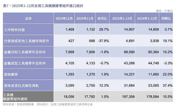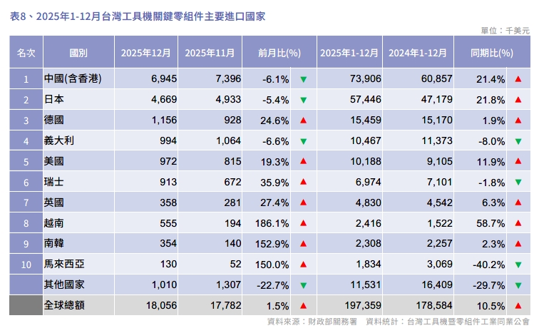2025 年12月台灣工具機及關鍵零組件進出口速報