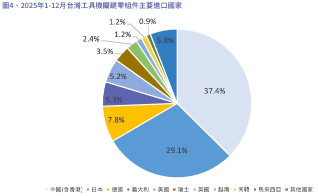2025年1-12月工具機關鍵零組進口累計進口金額為1.97億美元,較2024年同期增加10.5%。2025年1-12月工具機關鍵零組件主要進口國來看,中國(含香港)、日本、德國、義大利、美國、瑞士、英國、越南、南韓及⾺來⻄亞。相關數據請參考表7、表8 及圖4。