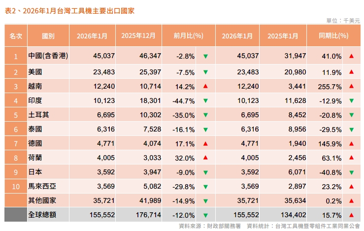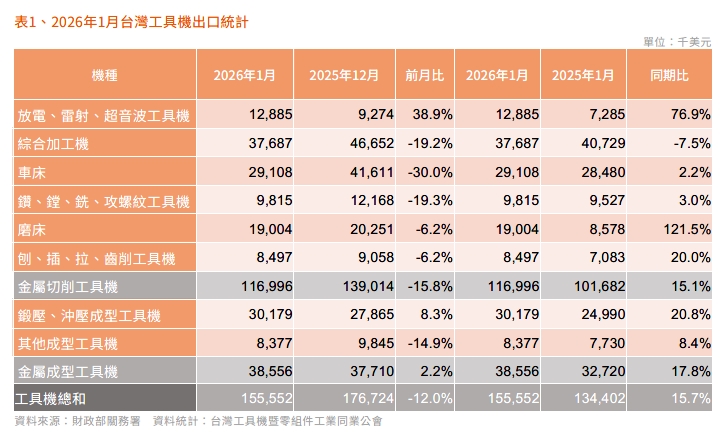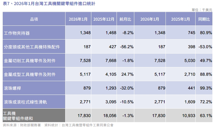 2026 年1月台灣工具機及關鍵零組件進出口速報